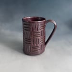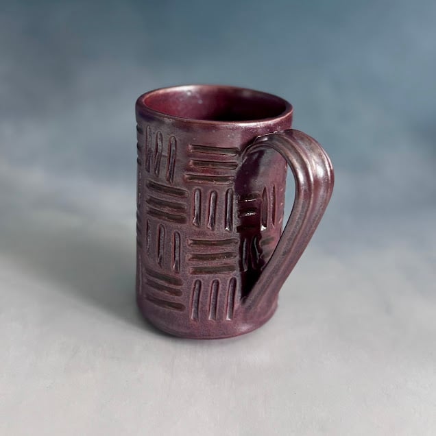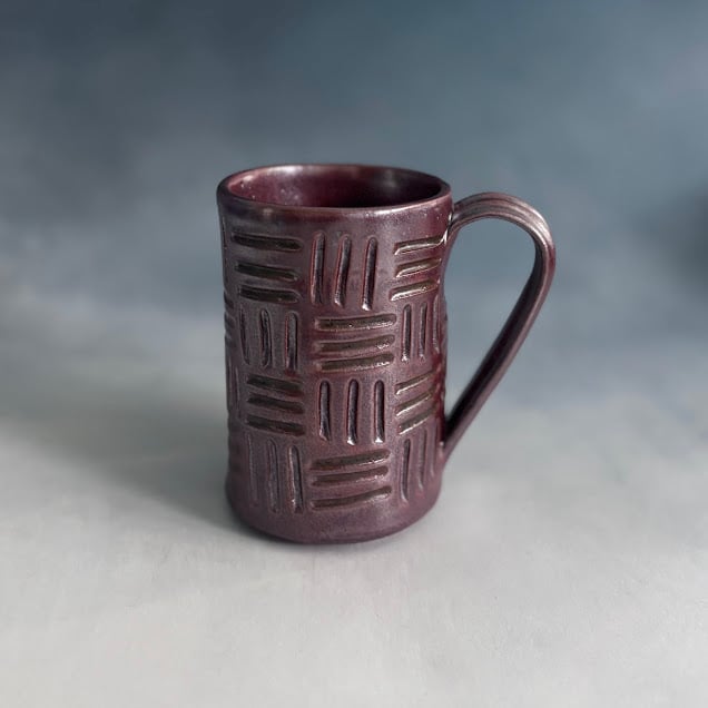 A study in texture and rich color, this mug features a stunning, all-over hand-carved basket-weave pattern. The deep, sparkling brick red glaze settles into the grooves of the texture, creating a beautiful depth across the surface. Its straight lines and comfortable handle give it a modern, yet timeless, rustic appeal. A perfect mug for hands-on, mindful sipping. It's a perfect companion to the Wavy Handle mug.